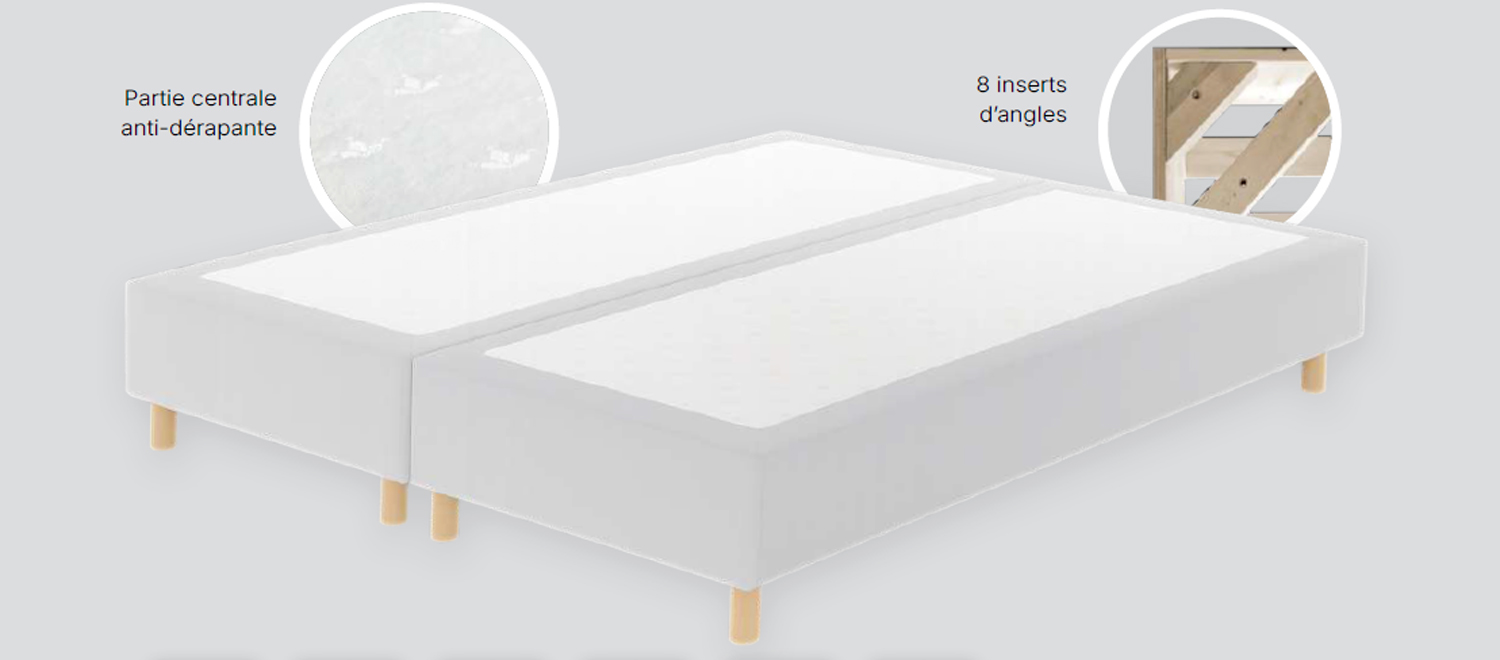 Bois et contreplaqué, Lattes passives, Toile de propreté, 8 inserts d’angle ØM8, Ouate polyester, Bande plateau cousue, 5 ans de garantie