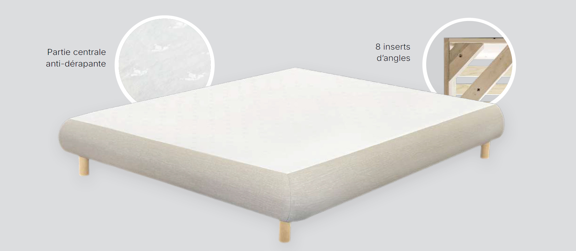 Bois massif, Lattes passives, Toile de propreté, 8 inserts d’angle ØM8, Ouate polyester, Bande plateau cousue, 5 ans de garantie